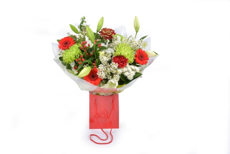 This design made in seasonal flowers including carnations, gerbera, chrysanthemums, spray carnations various foliage with a center glittered passion red rose, all carefully arranged in Christmas wrapping, this is sure to bring in the festive cheer.