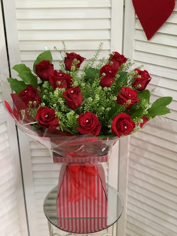 We use the best 60cm Freedom roses, complete with green bell filler and hard ruscus foliage, gift wrapped in cellophane within an aqua floral gift box.