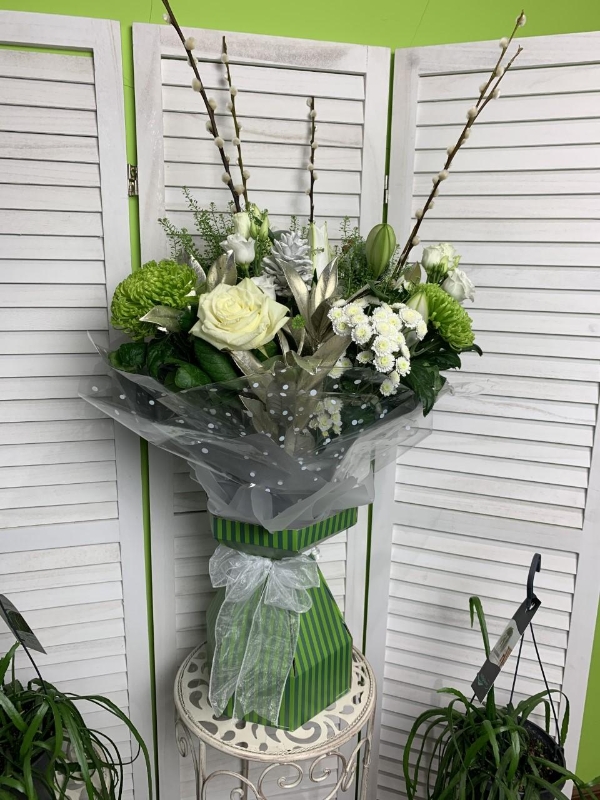 This Winter wonderland expresses everything about how magical Christmas is, the exquisite arrangement is large in size with 33 items arranged in a tall aqua box, this is truly a wonderful gift at Christmas